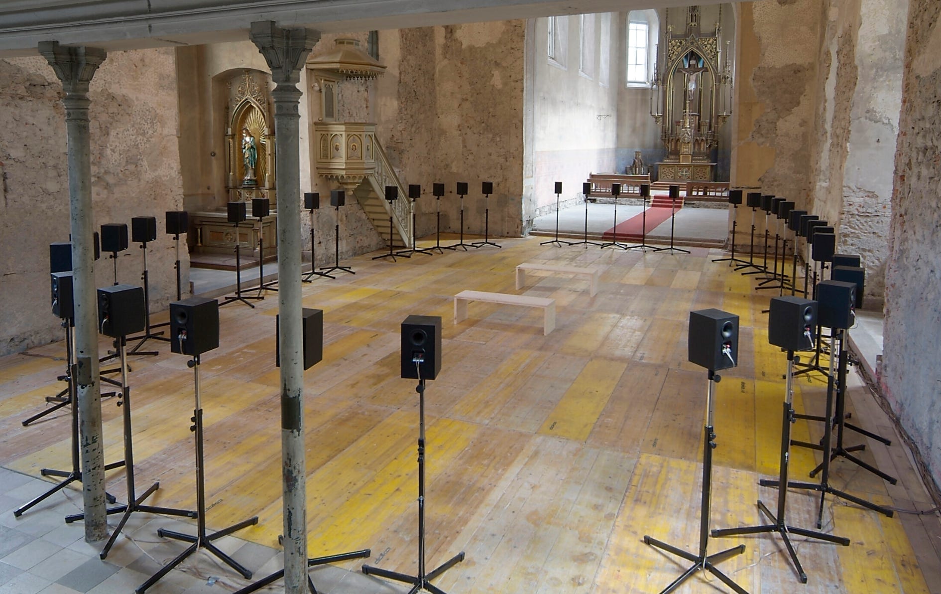 Janet Cardiff’s Forty Part Motet stunned me when I happened across it in Paris years ago. I stayed in the gallery for what must have been an hour; it’s subtlety and elegance stilled my body to a state of awe. Essentially, it is an installation of forty speakers conveying the different vocal components of a performance of “Spem in Alium” by Thomas Tallis 1573. The voices of the performers create a sculpture of sound, which visitors can move through. In-between performances, we hear vocalists chatting to one another, rustling papers, warming vocal chords and, honestly, is like no other experience of chorus music (which is not normally my bag); it brings you into the music from the viewpoint of the singers through a curious, gentle dance between embodiment and disembodiement.