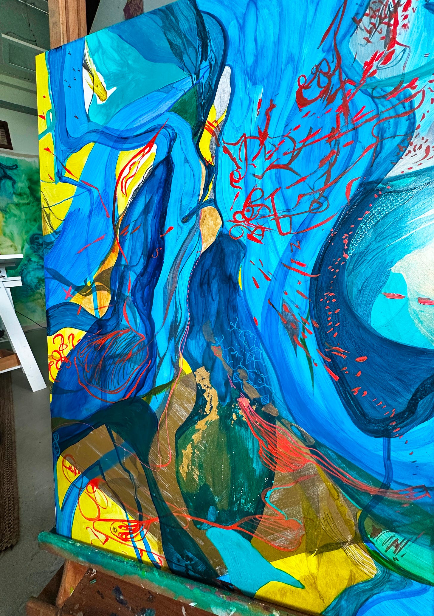 And here is an example of how I sometimes transfer these drawings into paintings - a work very much still in progress but here you can see a layer of soundscape (in red) collected from Pett Level beach: